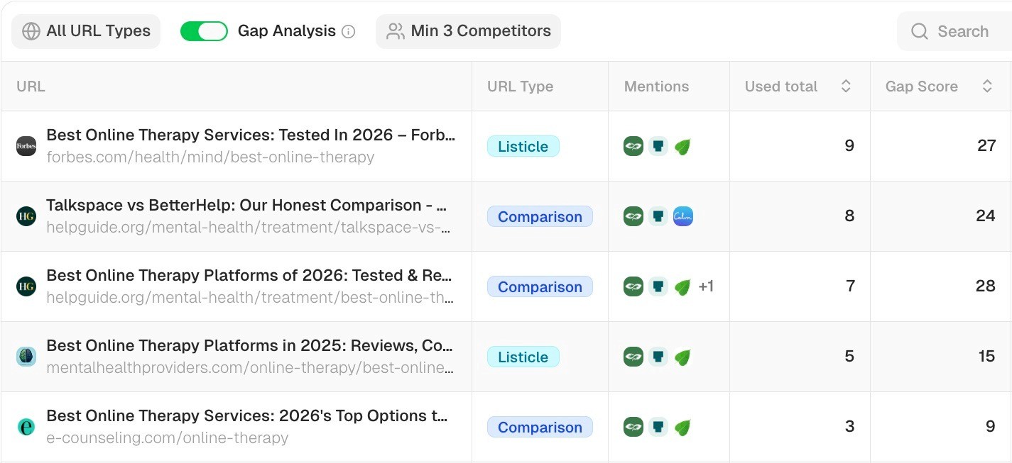Your brand isn't mentioned anywhere, but competitors are: This is where brand mention gap analysis becomes most valuable. Especially, if competitors similar to your brand are already getting mentioned.