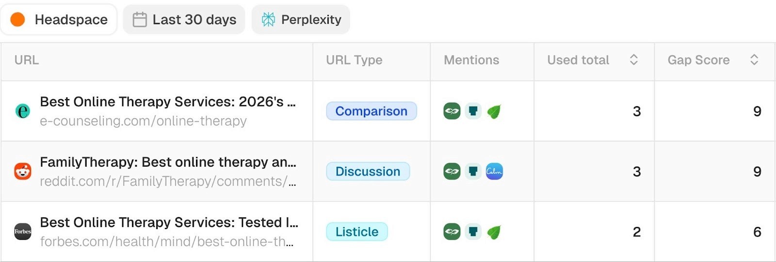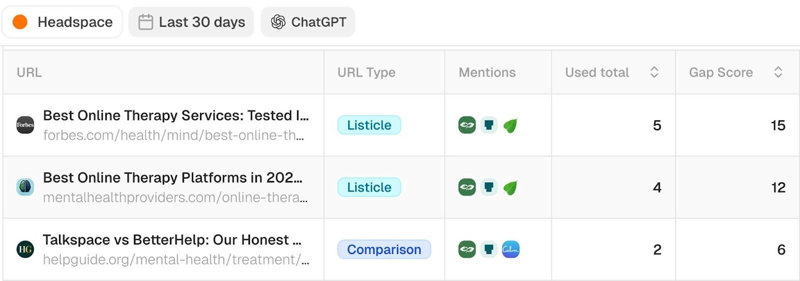 Looking at the data, we can see a high-intent article that mentions three or more of Headspace's competitors, but not Headspace itself. That's exactly the gap we're looking for.