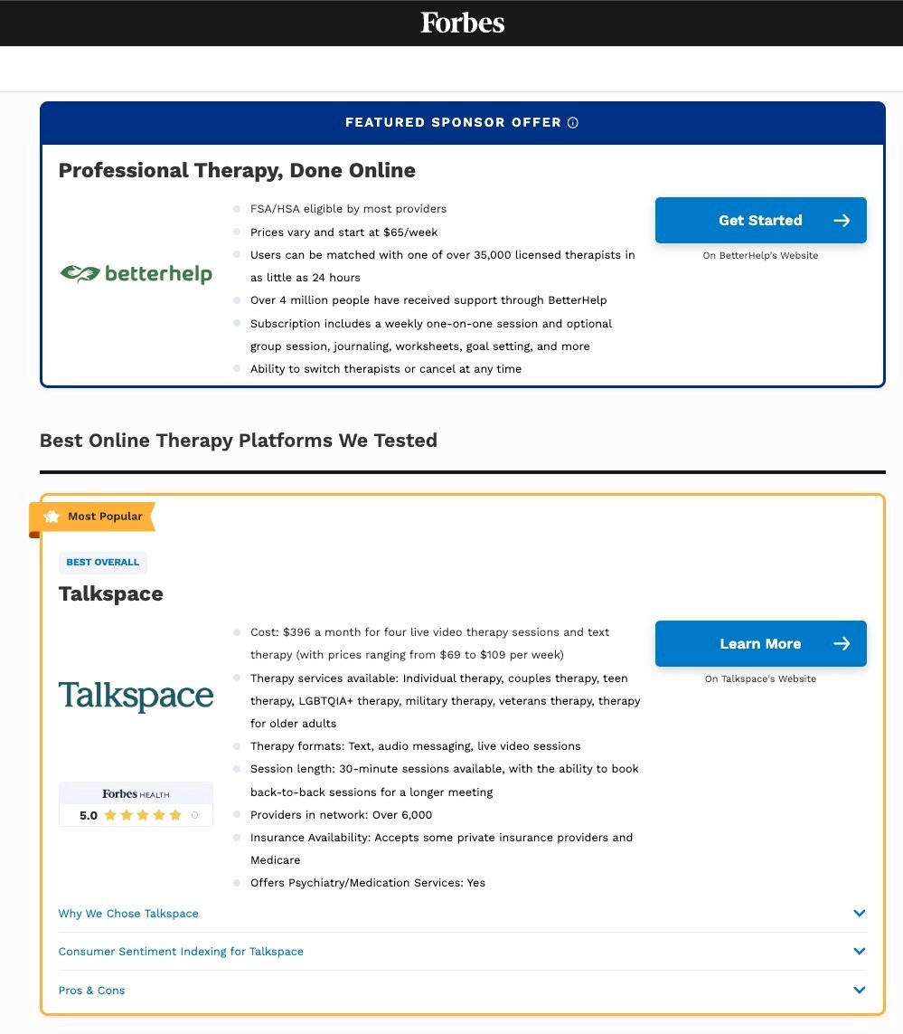 Screenshot: Competitor placement within the Forbes article showing featured positions.