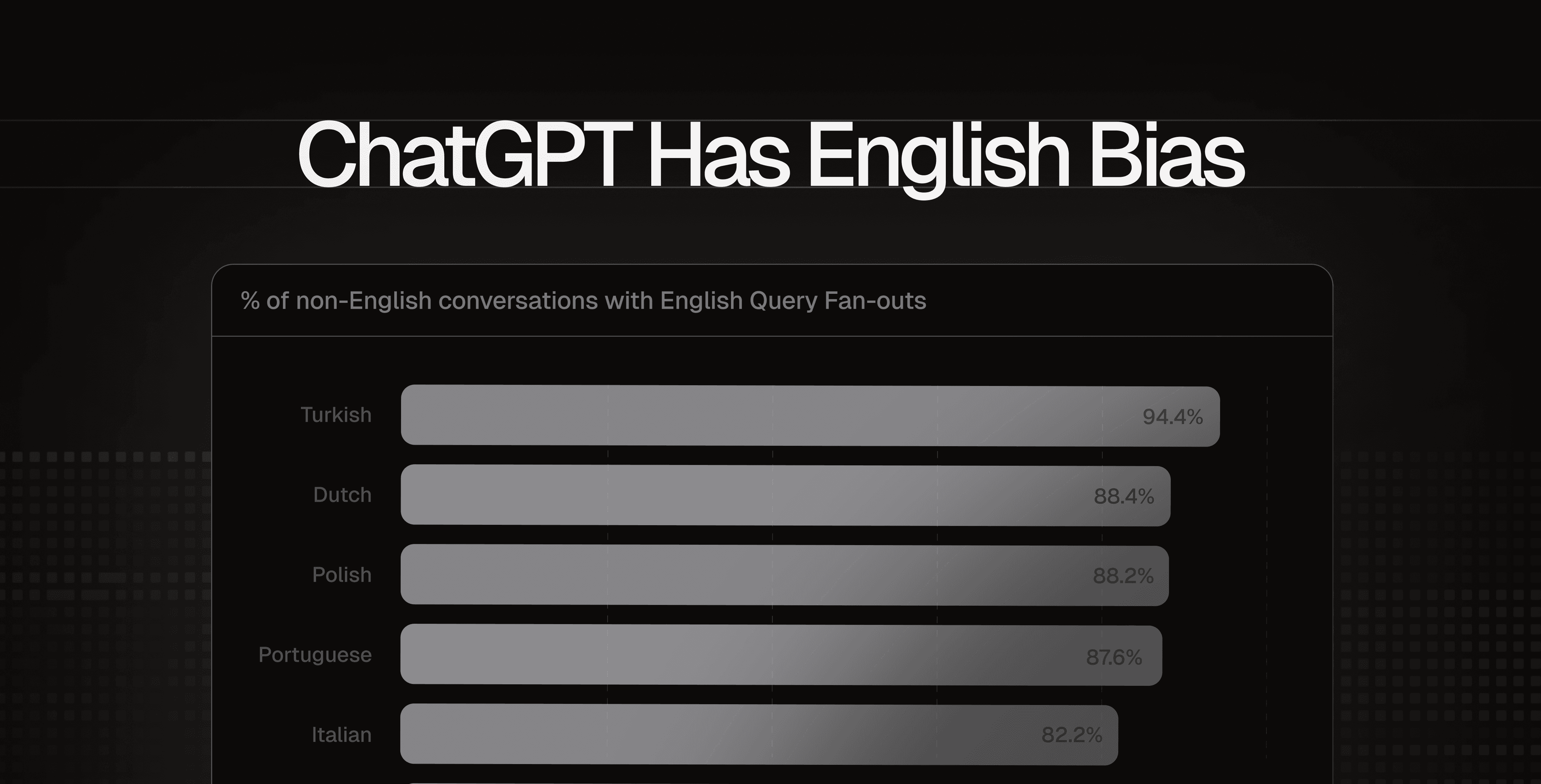 Here’s a more detailed breakdown of the languages we analyzed. Turkish queries switch to English most often at 94%, while Spanish is lowest at 66% - but even that means two thirds of Spanish searches in ChatGPT include English-language research. No non-English language falls below 60%.