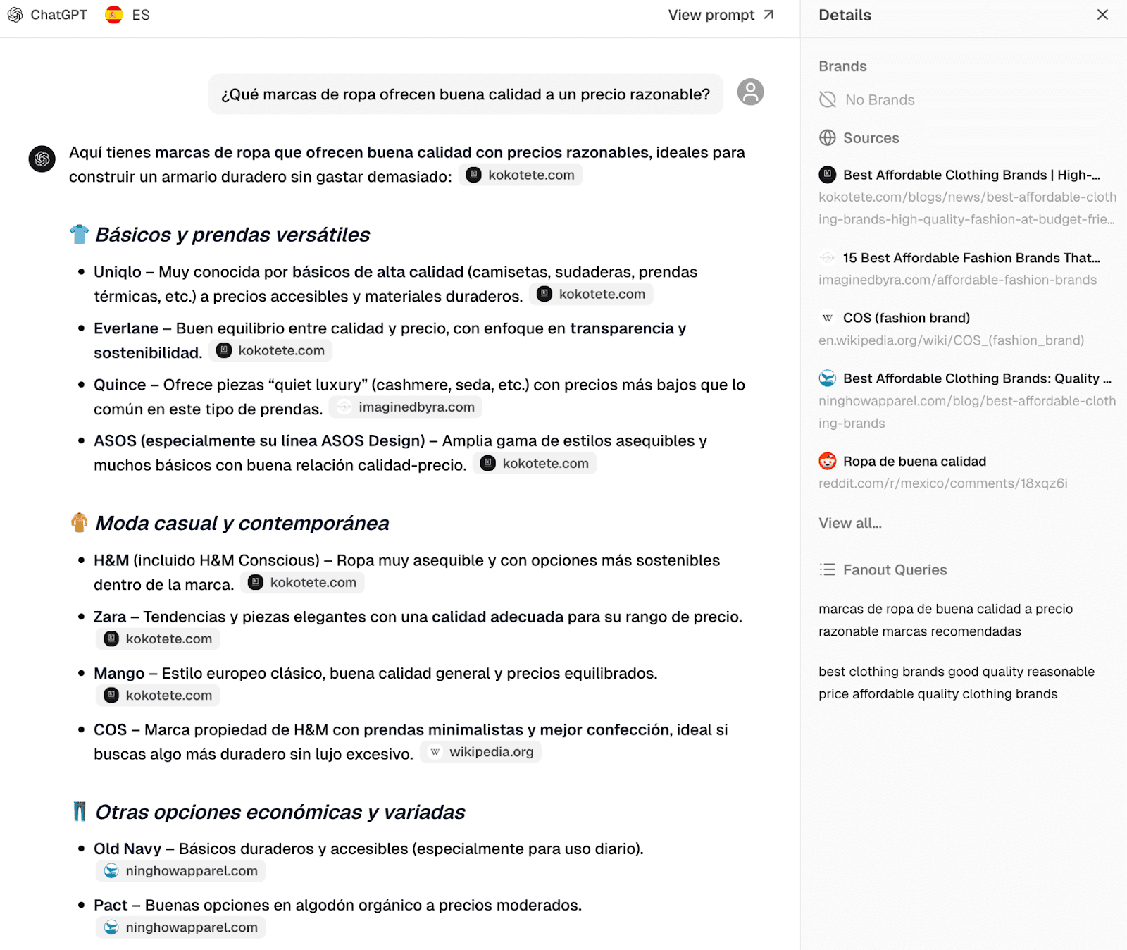 ChatGPT recommended two Spanish brands: Zara and Mango. Not bad - except the sources ChatGPT cited were all English-language sites: Kokolete.com, Imagedbyra.com, Wikipedia, Ninghowaparel.com.