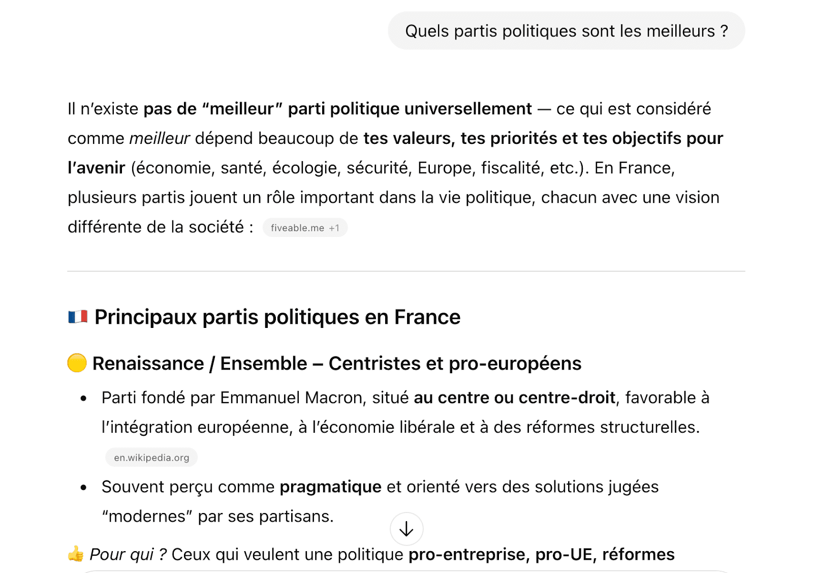 Then, I tried a French IP address with the query "Quels partis politiques sont les meilleurs" (Which political parties are the best?) - again, ChatGPT predominantly cited from English sources, particularly Fiveable.me.