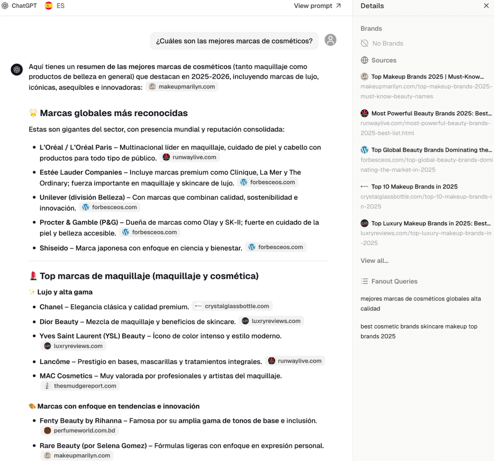 Notice what happened? We asked in Spanish about cosmetics brands, but in this test example ChatGPT added "global" on its own.