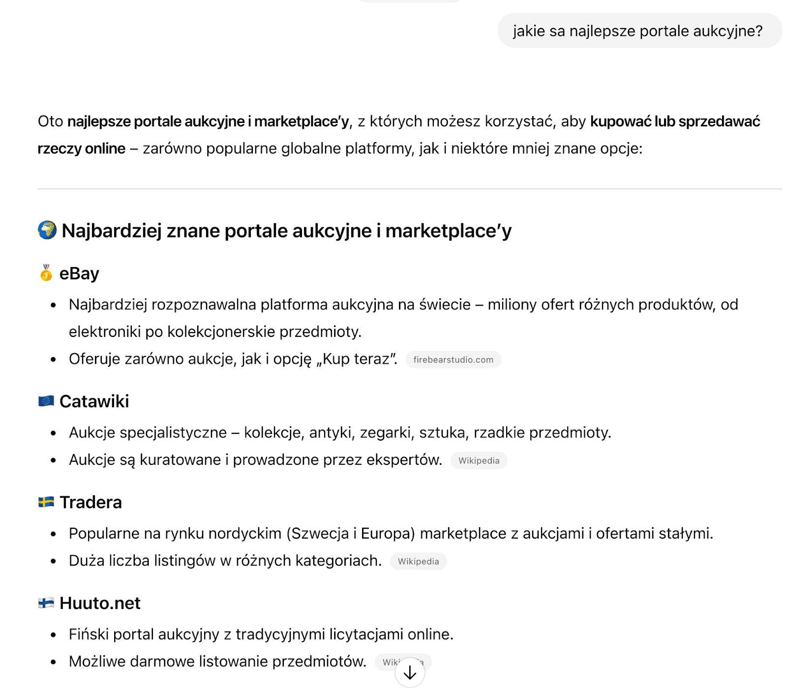 Here's an even more striking example. Ask ChatGPT in Polish using Polish IP address: "Jakie są najlepsze portale aukcyjne?" (What are the best auction portals?)