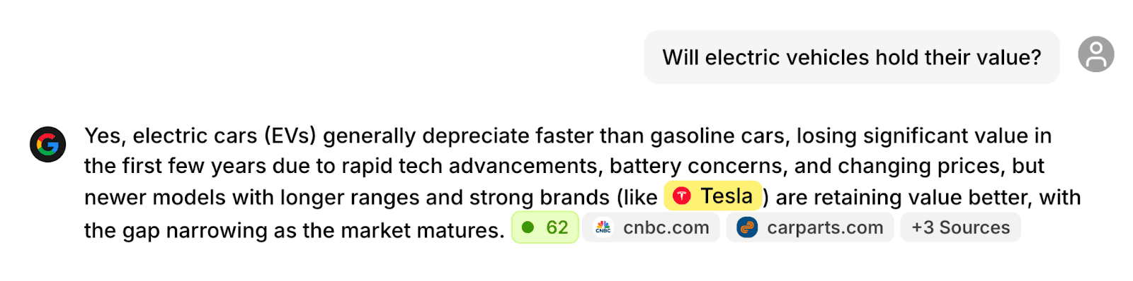 Let's look at a real example. Someone considering electric vehicles asks: "Will electric vehicles hold their value?” This is early-stage research. They're worried about depreciation, not asking about Tesla specifically.