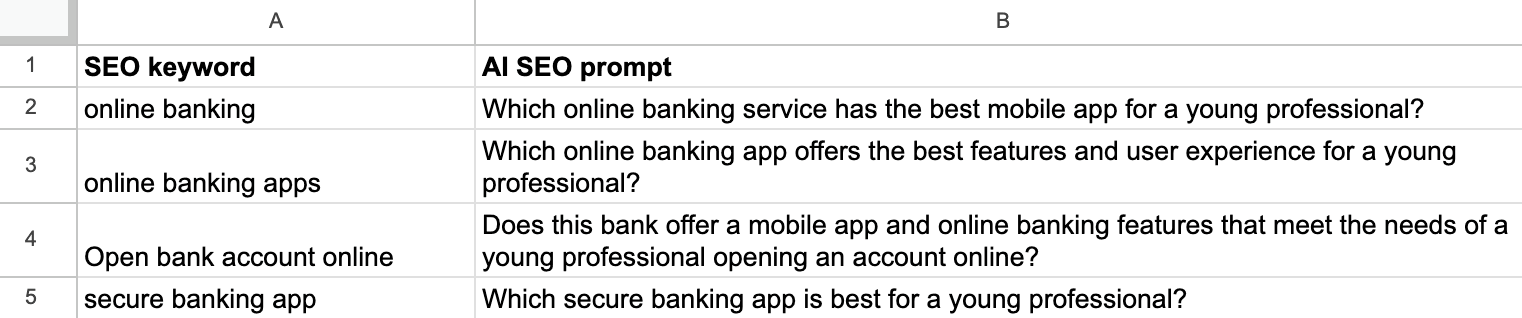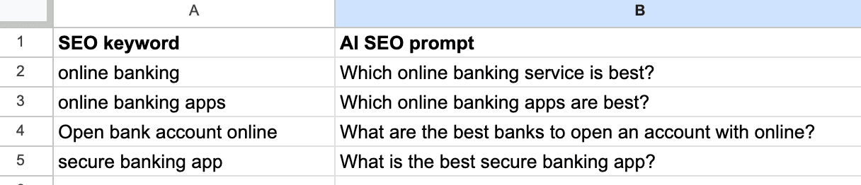 Here's the fastest way to build your initial prompt list. Pull your top-performing keywords from Google Search Console and convert them into natural questions.