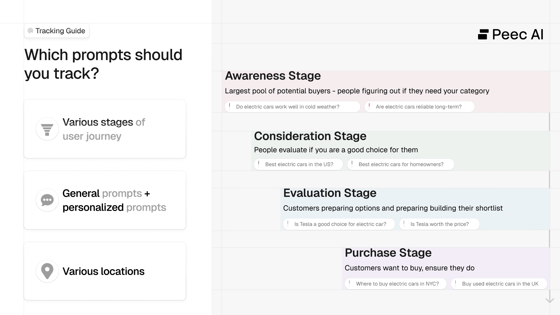 High-volume prompts matter, but so do the customer-specific variations that reveal positioning gaps. If you miss the journey stages, you will be invisible at critical decision moments which can cost you sales.