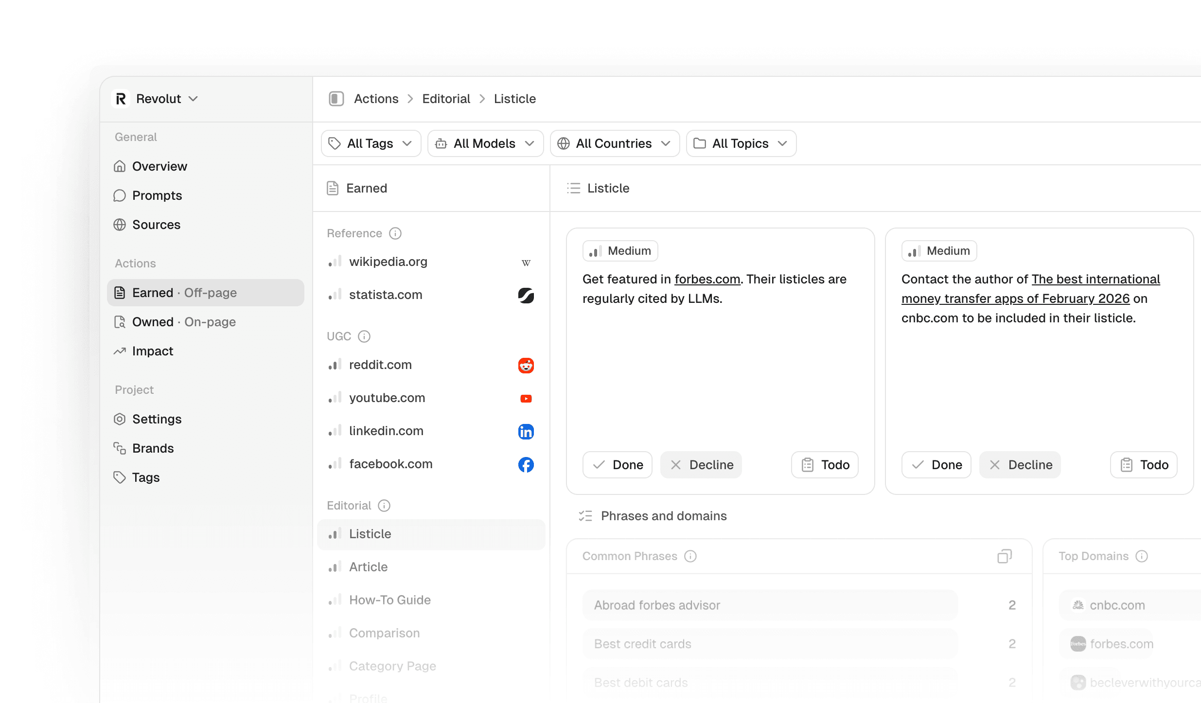Instead of going through sources row by row to manually decide what matters, Actions groups similar sources together, shows you where competitors are winning, and suggests specific steps you can take to close those gaps.