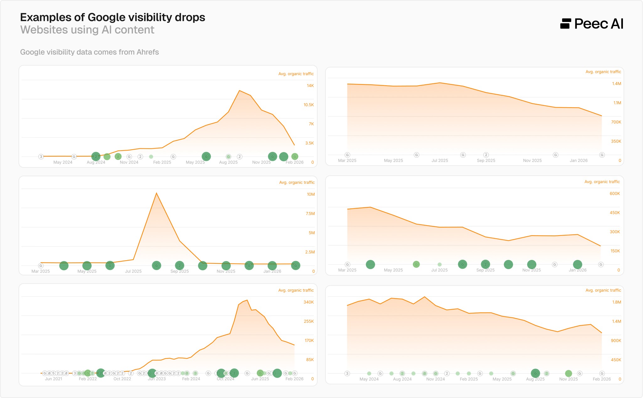 We looked at a portfolio of a few companies offering AI content generation and, no surprise, they commonly had massive visibility drops in Google.