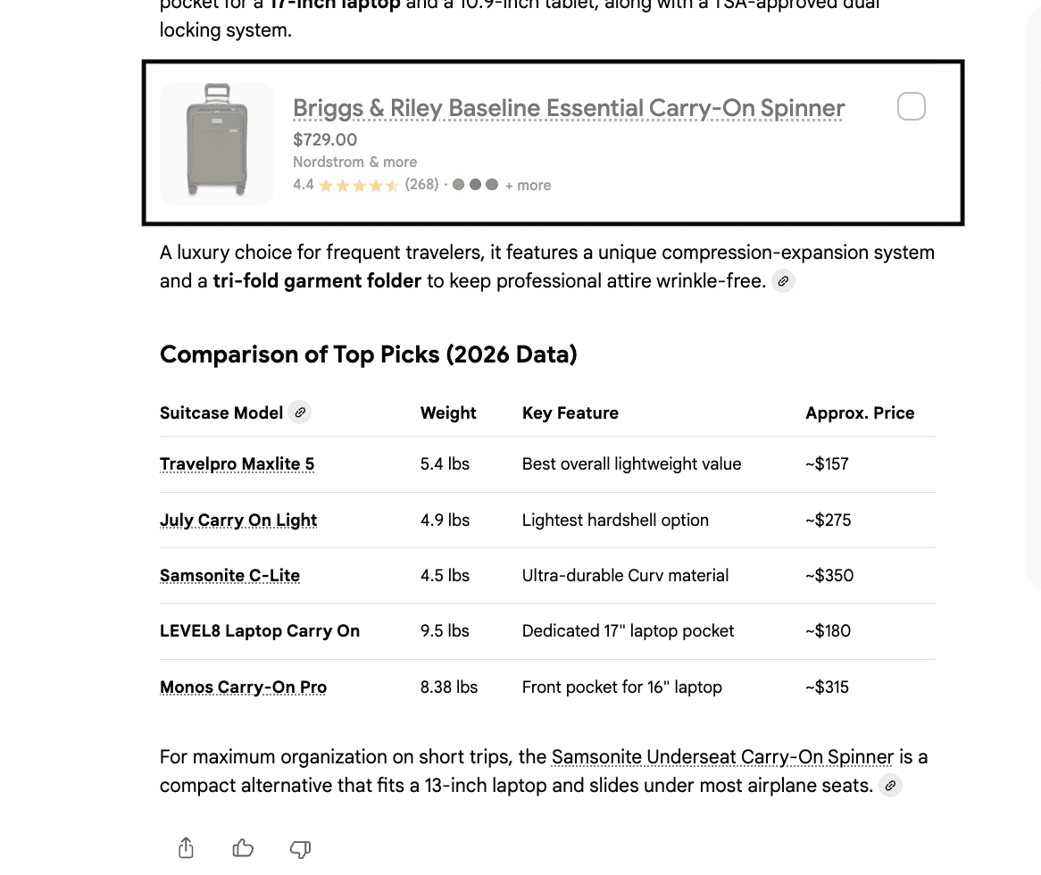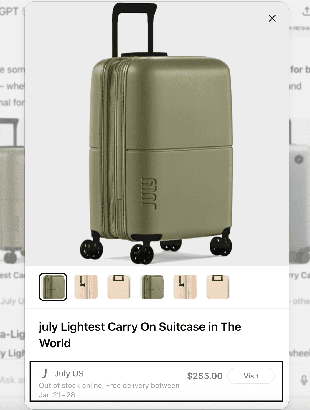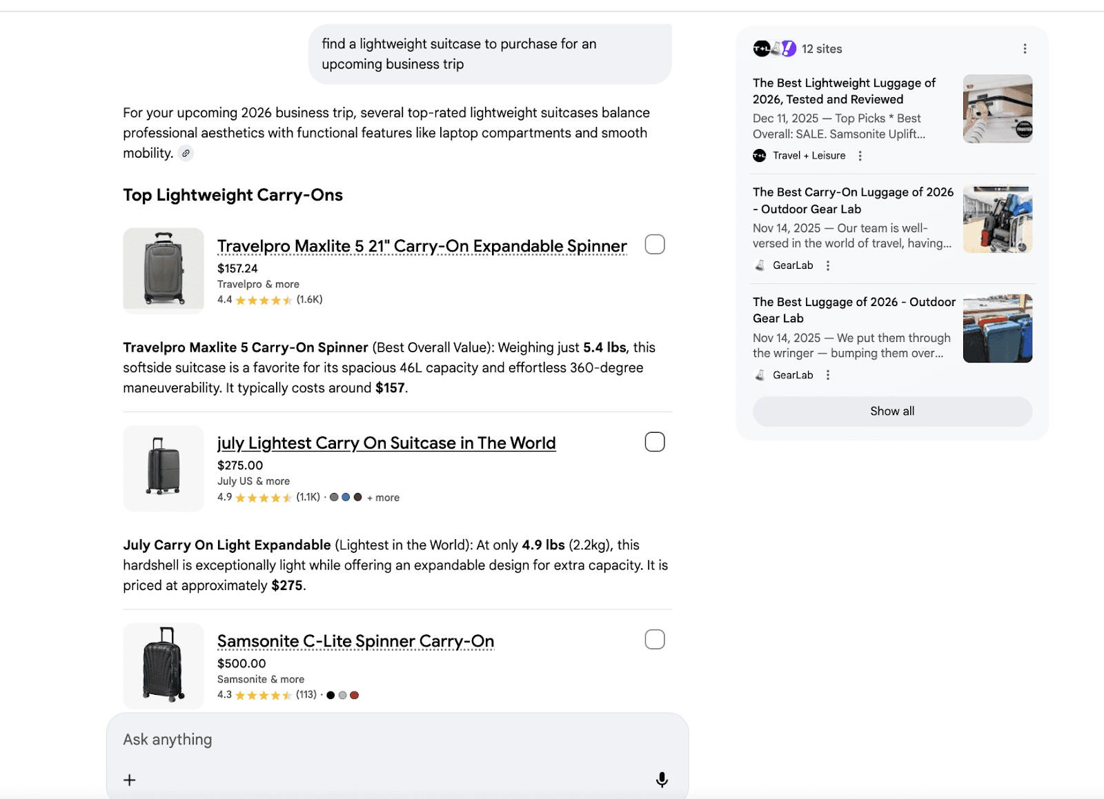 If you ask an AI assistant without direct access to Google’s Shopping Graph (such as ChatGPT) to recommend a suitcase and find the best price, it typically scrapes public shopping pages or affiliate feeds. It doesn’t have a direct integration with most merchants’ inventory and pricing systems. That causes several problems: