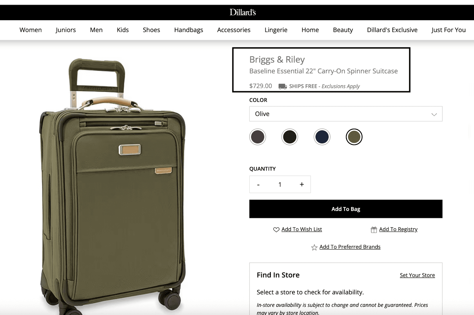 Click through to the merchant and you’ll often find a completely different price on their website. AI Mode said Dillard’s has the suitcase for $182 but it’s actually $729: