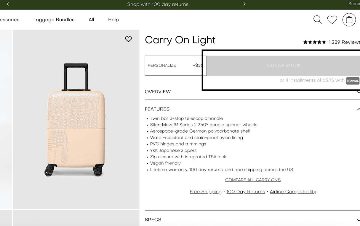 We click through to the merchant to try and place the order only for the suitcase to be both out of stock and us unable to place the order.