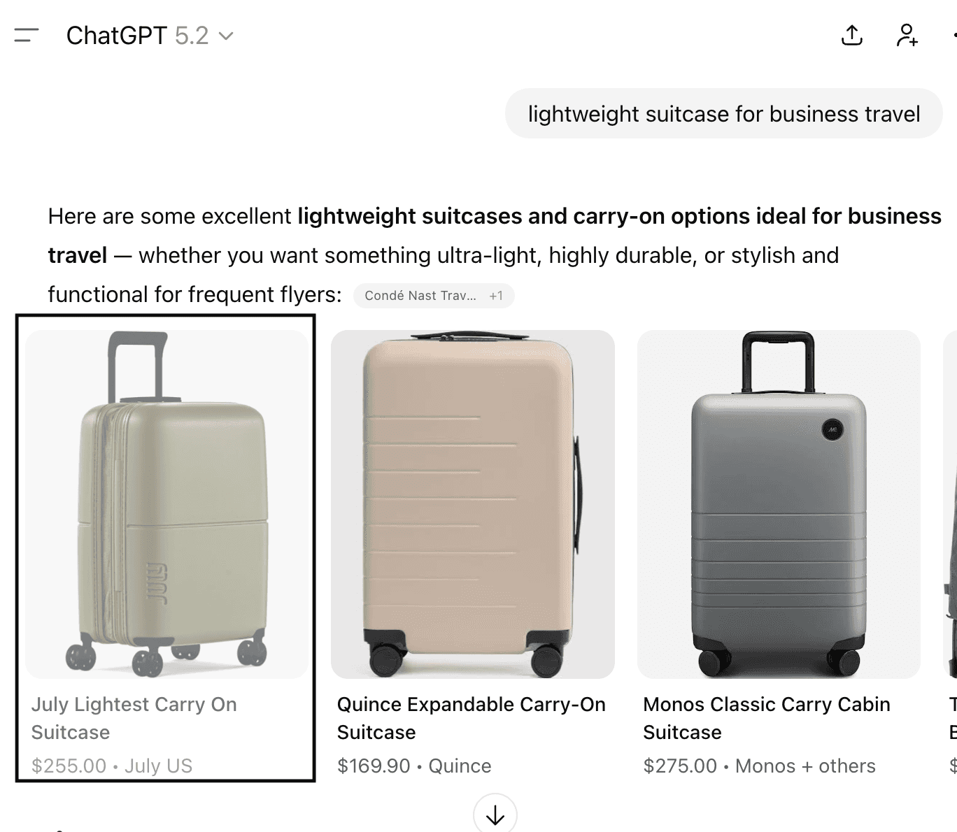We asked ChatGPT to find a “lightweight suitcase for business travel”: