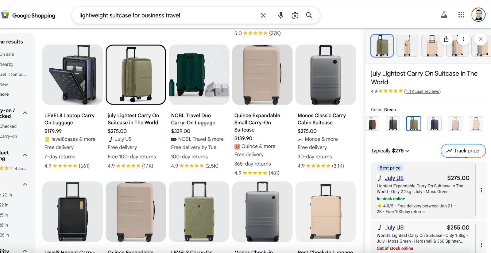 Search for a product in Google AI Mode, such as the lightweight suitcase for a business trip, and browse the surfaced listings.