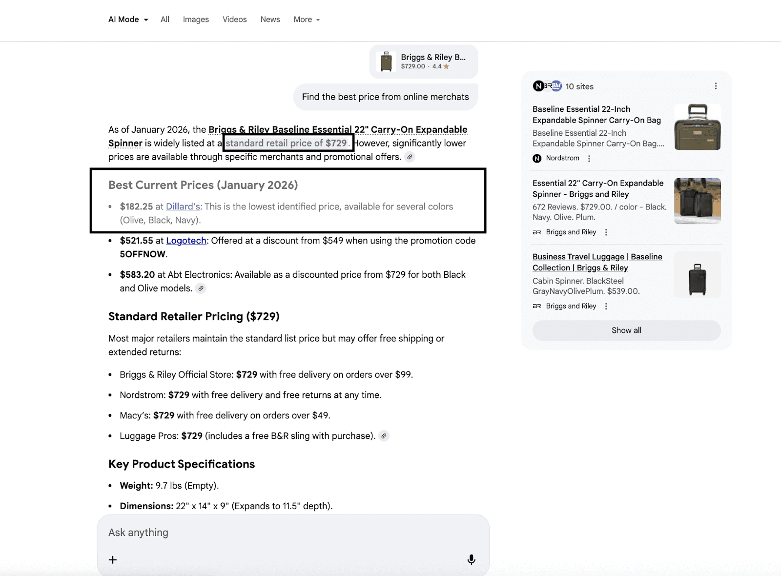 Checking that product box, we ask AI mode to find the merchant with the best price, Dillard's at ~$182: