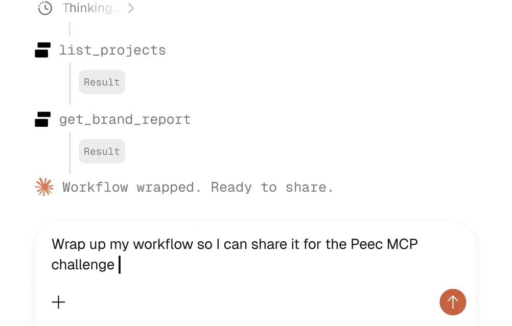 Build a repeatable workflow powered by Peec MCP that solves a real problem. Automated reports, competitive monitoring, content audits, anything that saves time and runs more than once.