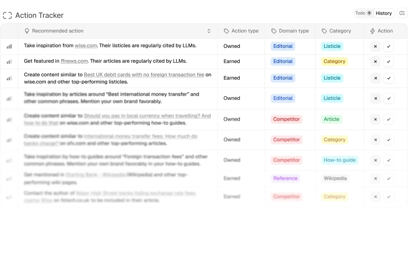 Turn visibility data into a clear action plan. Know exactly what to do to get recommended by ChatGPT, Perplexity, Claude, and Gemini.